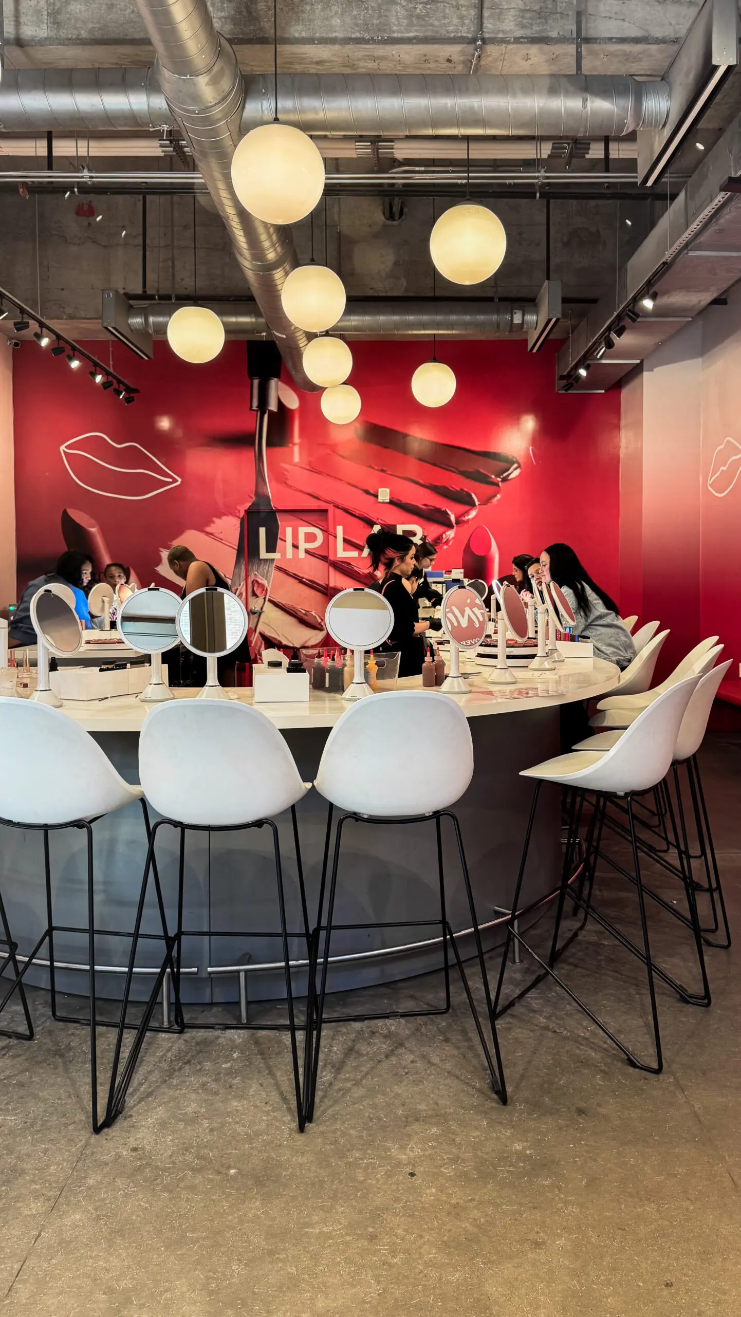Inside Fifth + Broadway. Work with a color expert to create your own custom lipstick — shade, flavor, finish, and engraved tube. Clean, vegan, and genuinely fun. ~$60/lipstick, $40 each additional. Book at least a month ahead for weekends — walk-ins are not guaranteed.